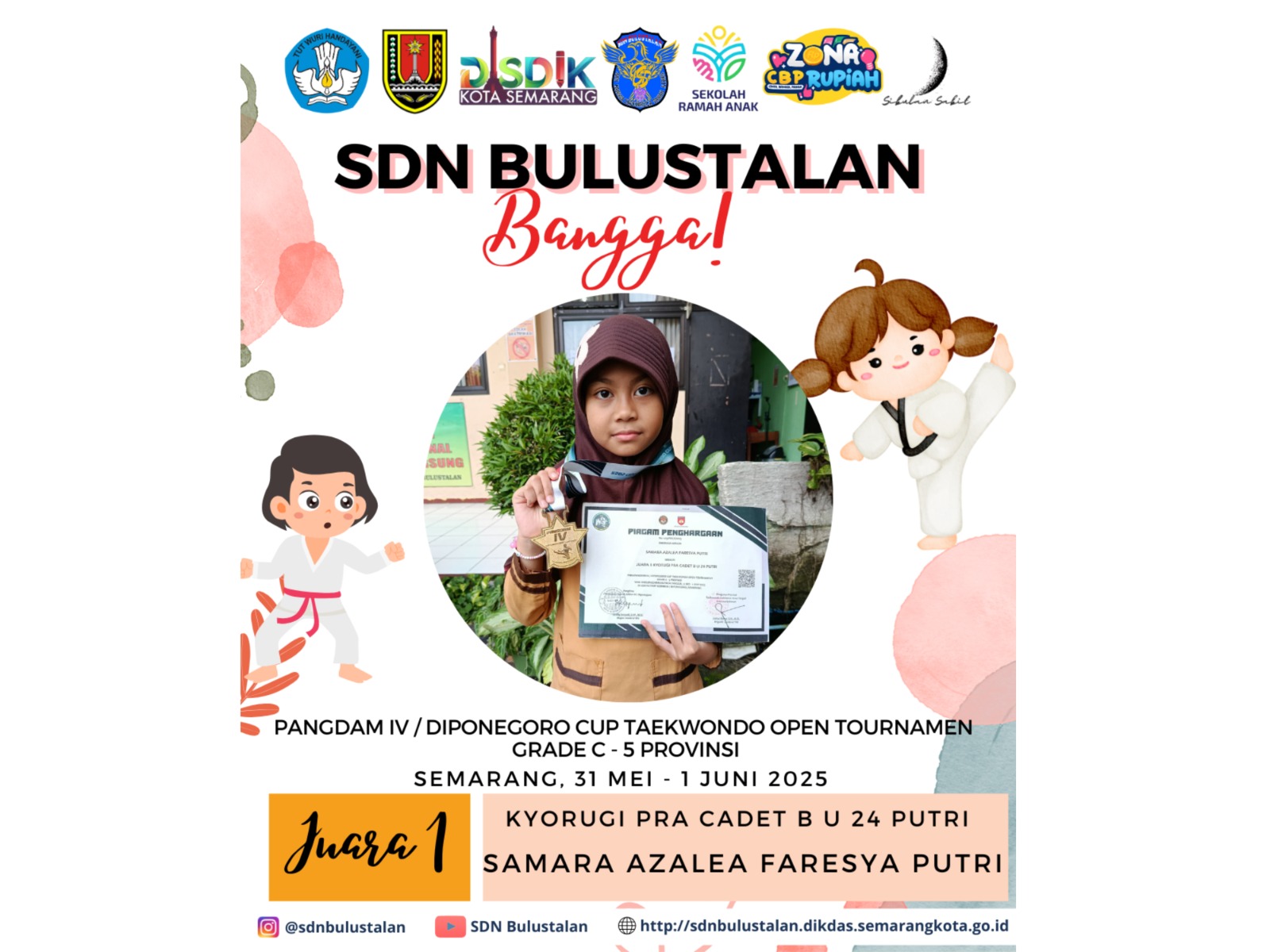 Keluarga besar SDN Bulustalan tengah diselimuti rasa bangga atas prestasi luar biasa yang diraih oleh salah satu siswi terbaiknya, Samara Azalea Faresya Putri. Dalam ajang bergengsi Pangdam IV/Diponegoro Cup Taekwondo Open Tournament Grade C - 5 Provinsi, Samara berhasil mengukir prestasi emas dengan menyabet Juara 1 pada kategori Kyorugi Pra Cadet B U 24 Putri. Kompetisi tingkat provinsi ini berlangsung sengit pada tanggal 31 Mei hingga 1 Juni 2025, bertempat di Semarang, dan diikuti oleh ratusan atlet berbakat dari berbagai daerah.